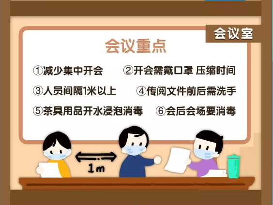 四、减少集中开会,尽量采用网络会议,如特别情况必须在会议室开会,佩戴口罩,进入会议室前洗手消毒。开会人员间隔1米以上。控制会议时间,会议时间过长时,开窗通风。会议结束后场地、会议桌椅进行消毒。
