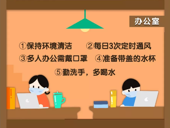 三、办公室或教室经常开窗通风换气,每日通风不少于3次,每次不少于30分钟,在与同事交谈或排队时保持1米以上距离,多人办公需要戴口罩;相互之间不要握手。保持勤洗手、多饮水,坚持在进食前、如厕后按照六步法严格洗手。接待外来人员双方佩戴口罩。