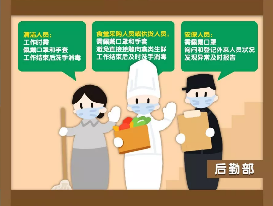 八、后勤人员(服务人员、安保人员、清洁人员)工作时须佩戴口罩,并与人保持安全距离。食堂采购人员或供货人员须佩戴口罩和一次性橡胶手套,避免直接手触肉禽类生鲜材料,摘手套后及时洗手消毒。保洁人员工作时须佩戴一次性橡胶手套,工作结束后洗手消毒。安保人员须佩戴口罩工作,并认真询问和登记外来人员状况,发现异常情况及时报告。