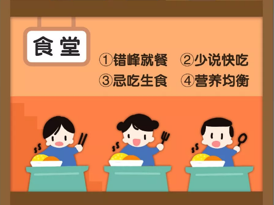 七、避免扎堆就餐,有条件的教职工可以自带餐盒,打包带回宿舍单独就餐。如果是在学校餐厅就餐,采用分餐进食,避免人员密集。应和其他人保持距离,尽量不要面对面坐,不交谈、不看手机,降低感染风险。