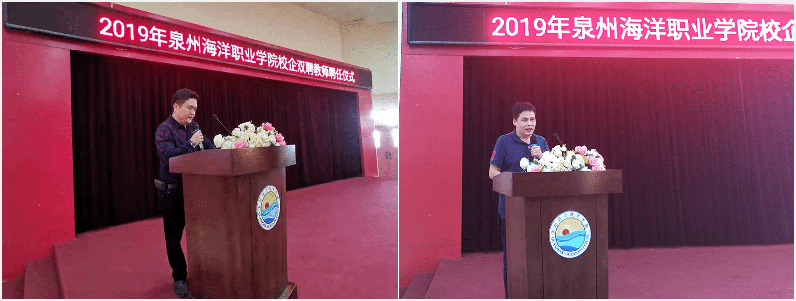 “校企双聘”教师代表郭永坤副教授和傅文忠教授,分别就近年来校企合作取得成绩和个人成长经历,说明现代企业需要动手实践能力强,能够在工作当中独当一面的人才,同时也表示“校企双聘”这种模式将在高职院校中发挥着重要的作用。