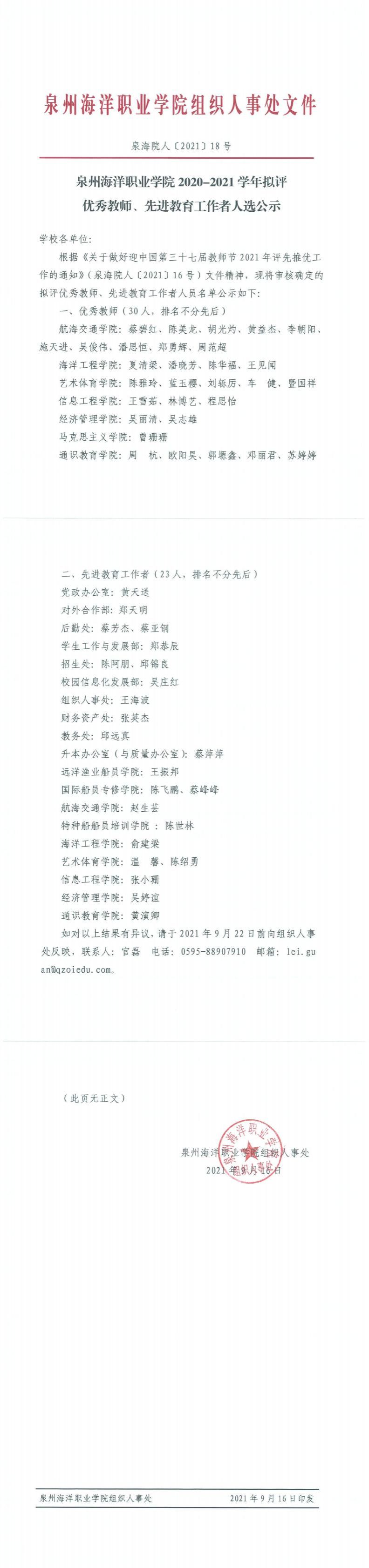 泉州海洋职业学院2020-2021学年优秀教师、先进教育工作者人选公示