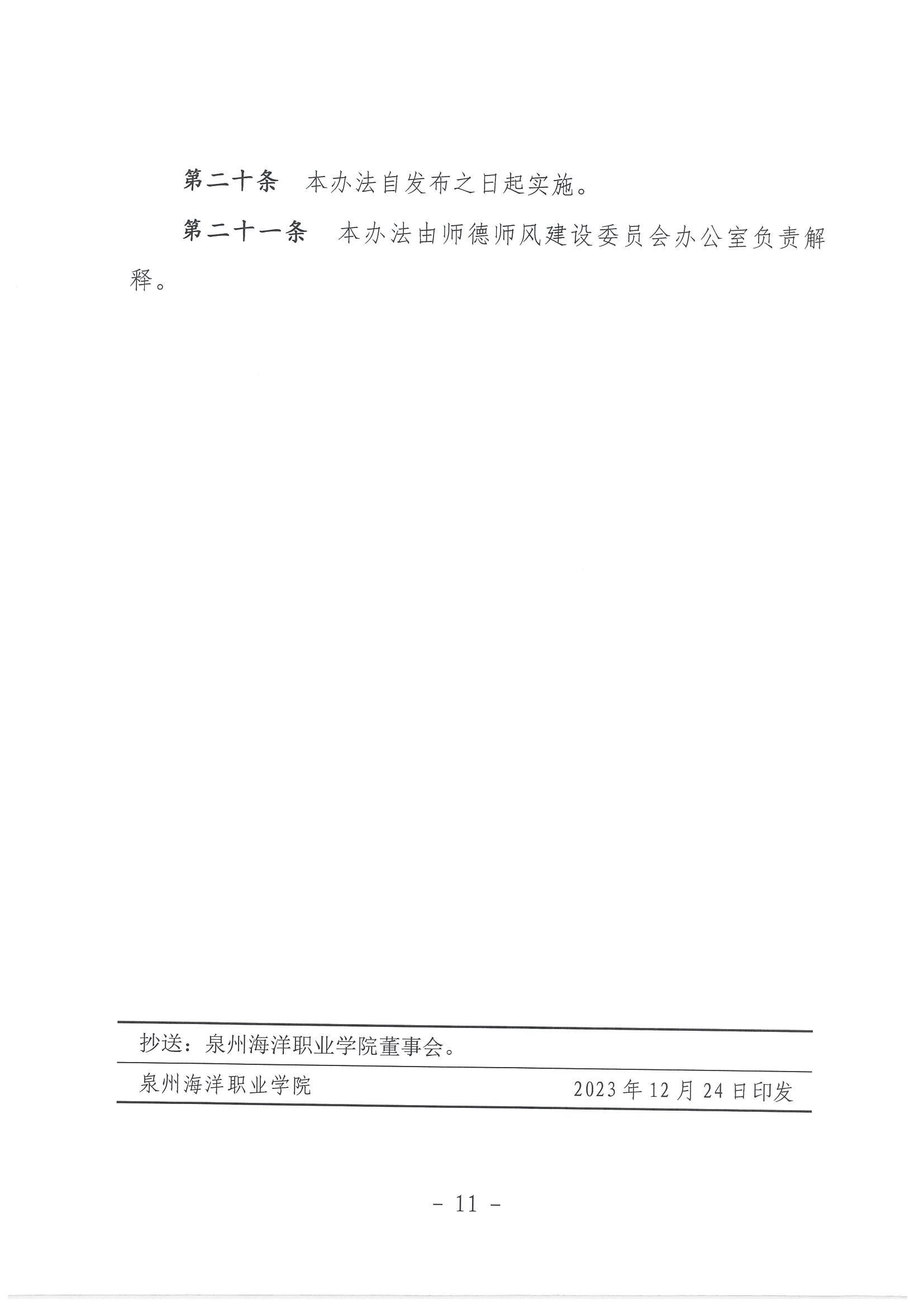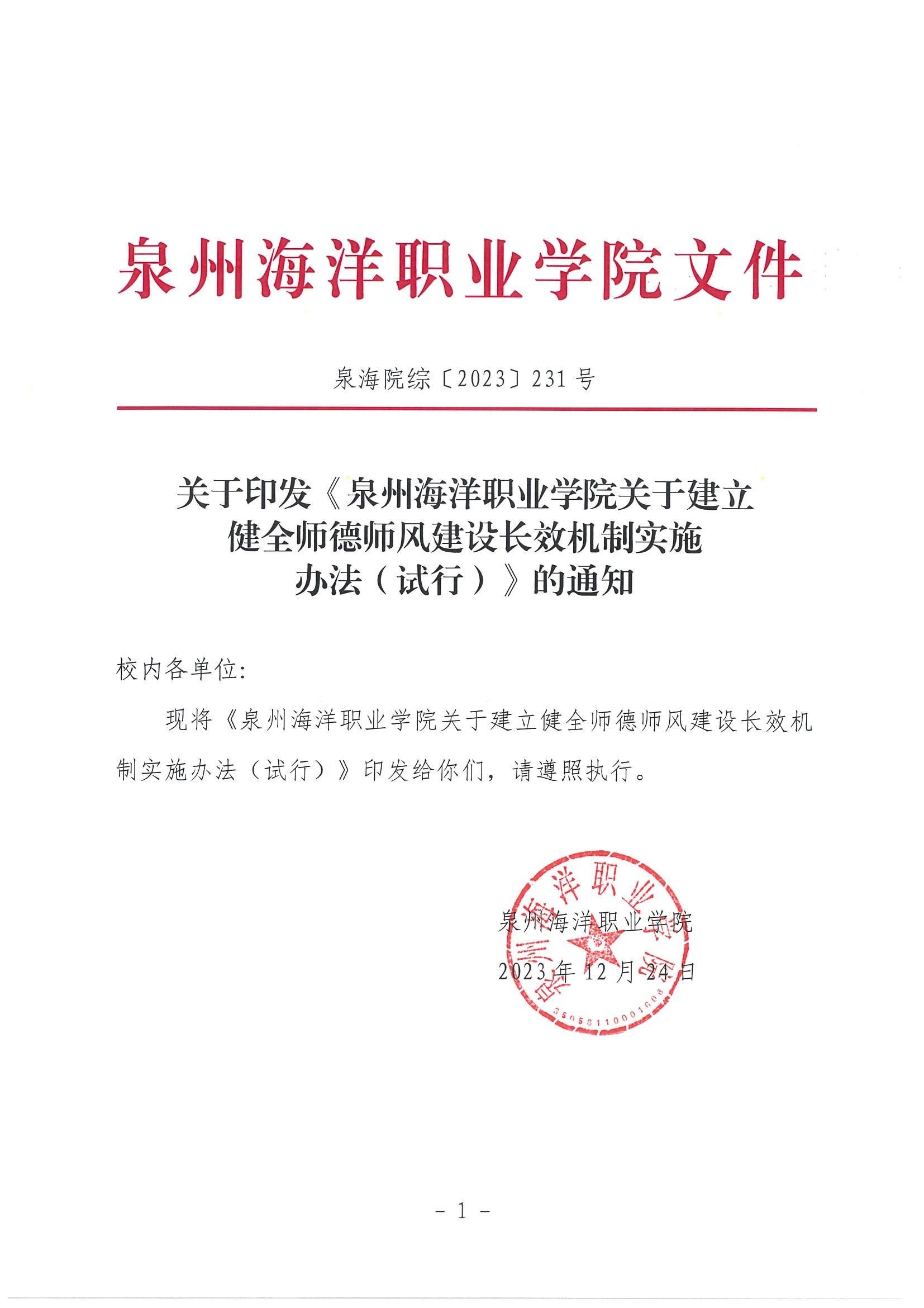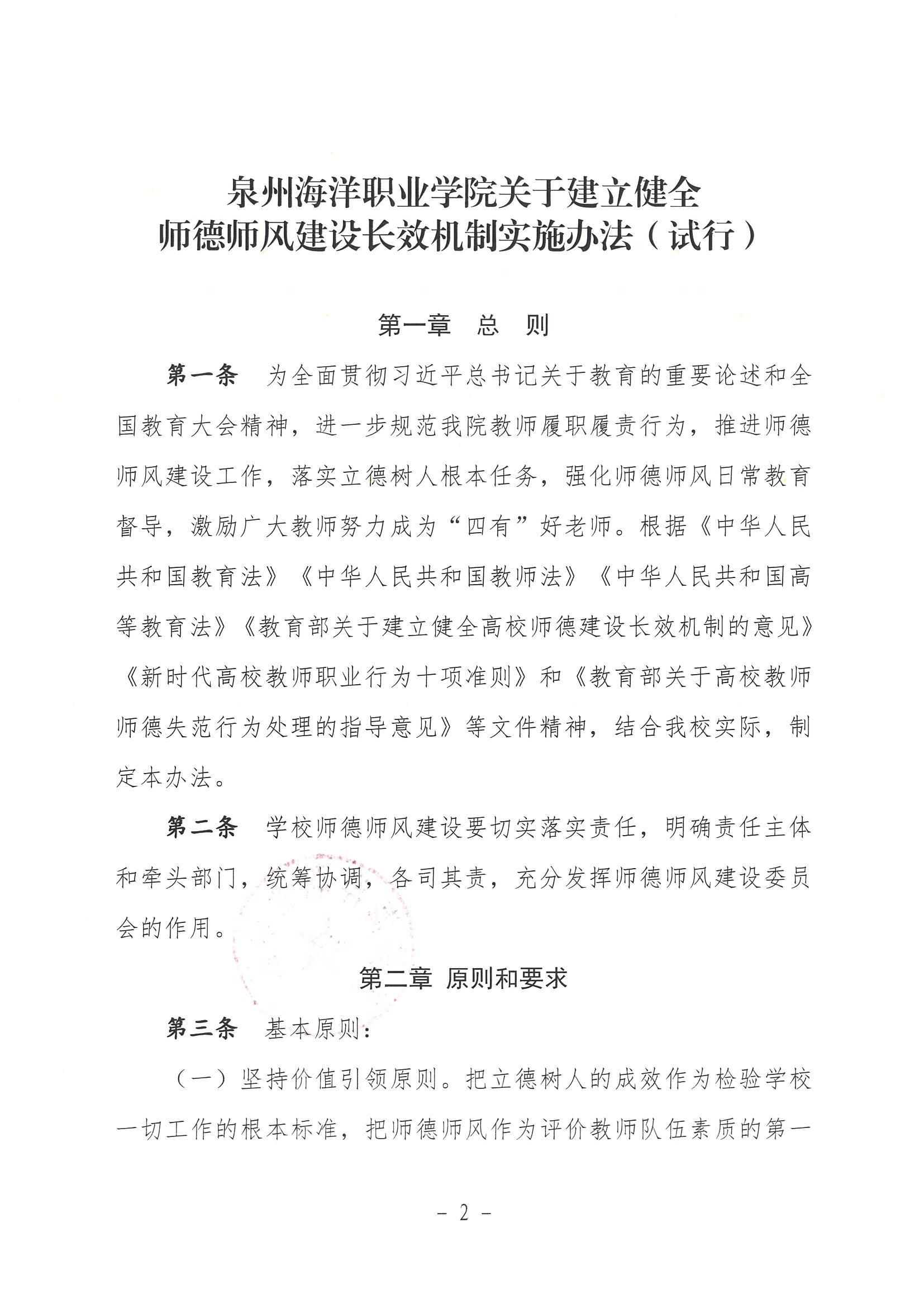 泉州海洋职业学院关于建立健全师德师风建设长效机制实施办法(试行)