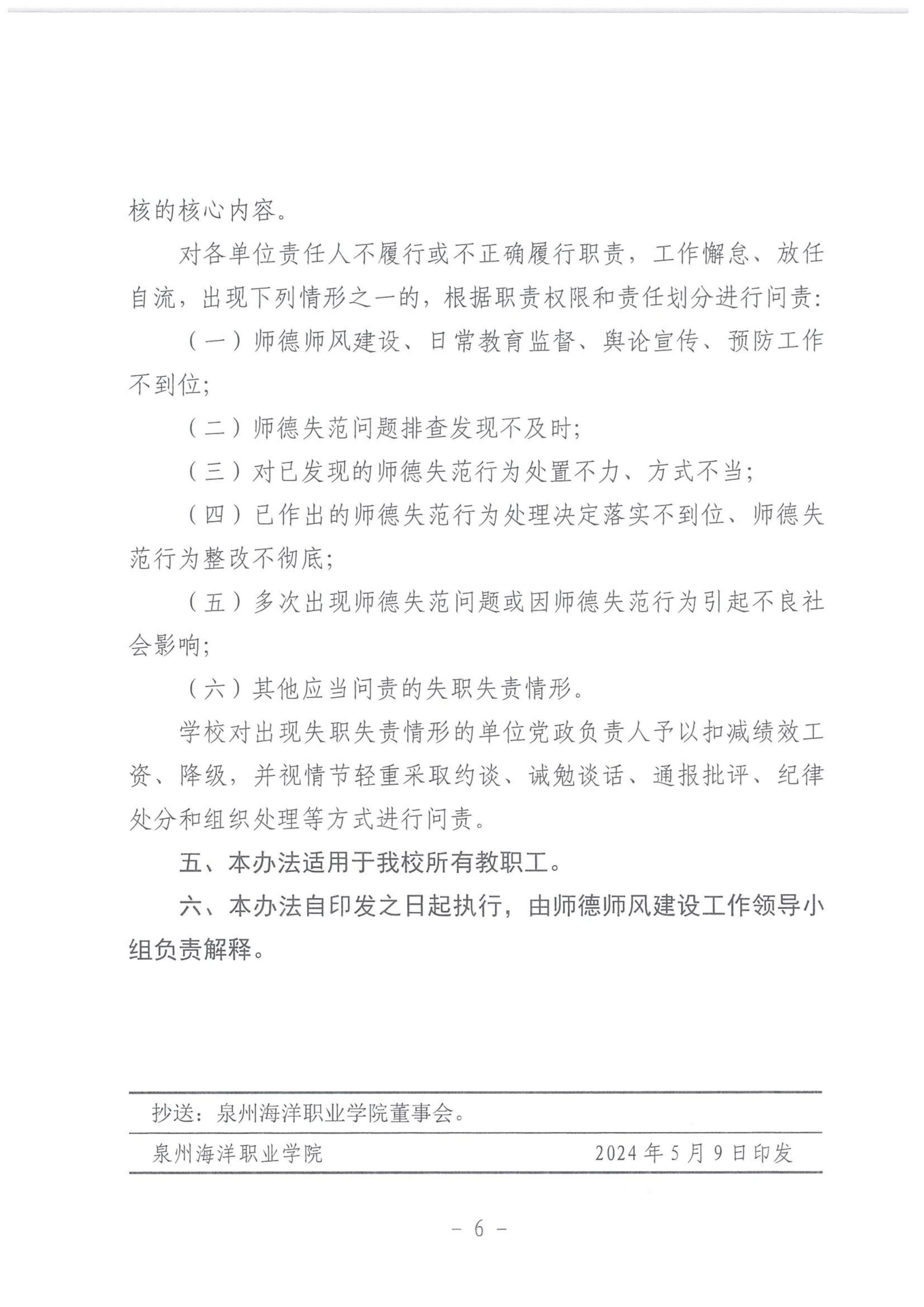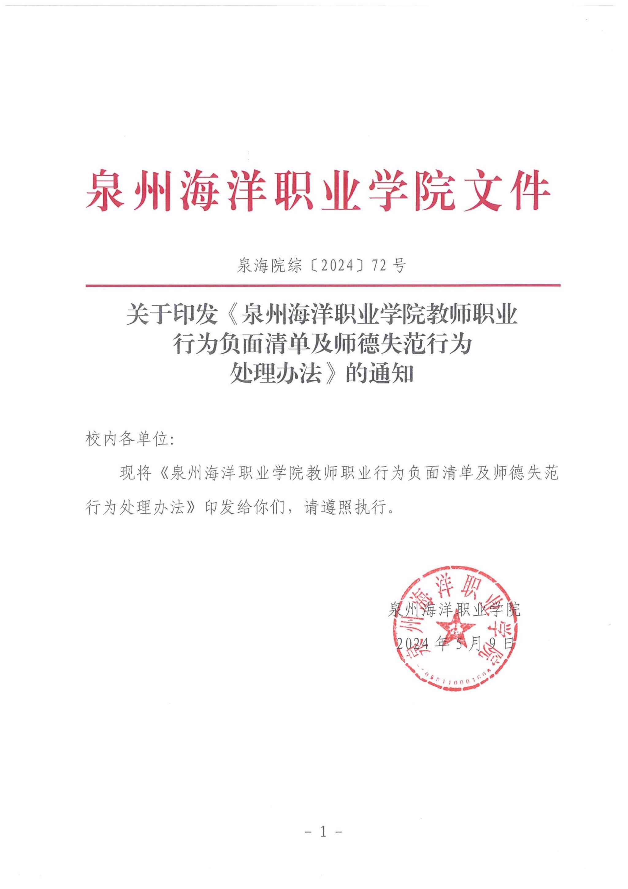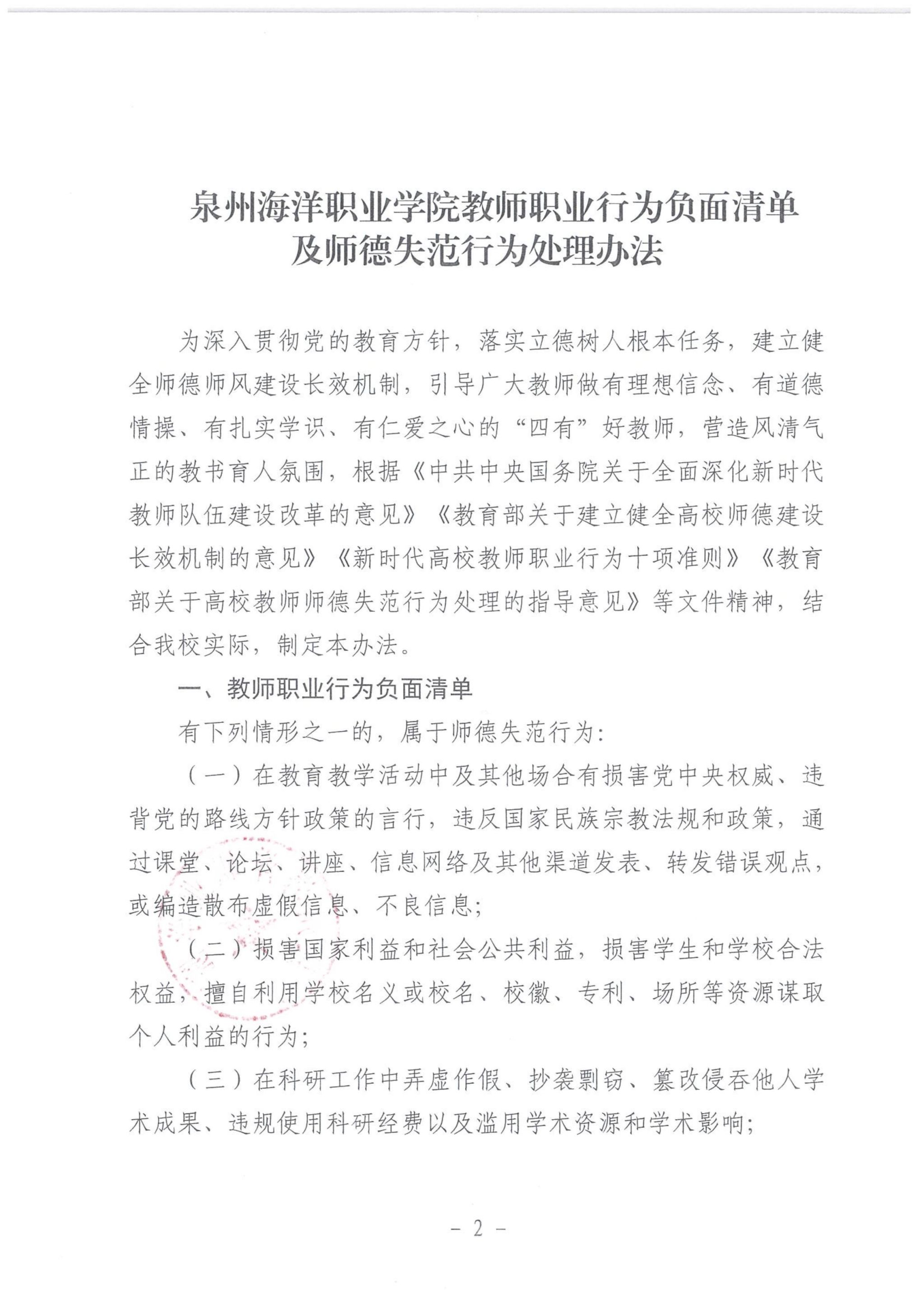 泉州海洋职业学院教师职业行为负面清单及师德失范行为处理办法
