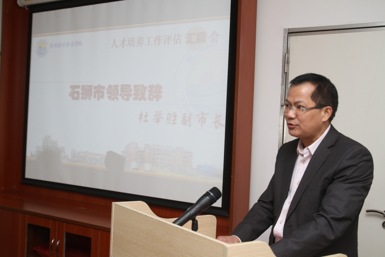 杜举胜副市长致辞,他言简意赅地向专家组介绍泉州和石狮的海外经济贸易往来的历史及发展现状,并对学院近年来的办学表示肯定。他认为泉州海洋职业学院虽然办学历史不长,但特色鲜明;虽然规模不大,但办学规范,质量优良,在地区具有良好的办学声誉。他恳请专家组为学院发展提出建设性的指导意见和建议,多传经送宝,他希望学院以此为契机,认真听取专家组的意见和建议,改进工作,全面提升人才培养质量和综合办学实力。
