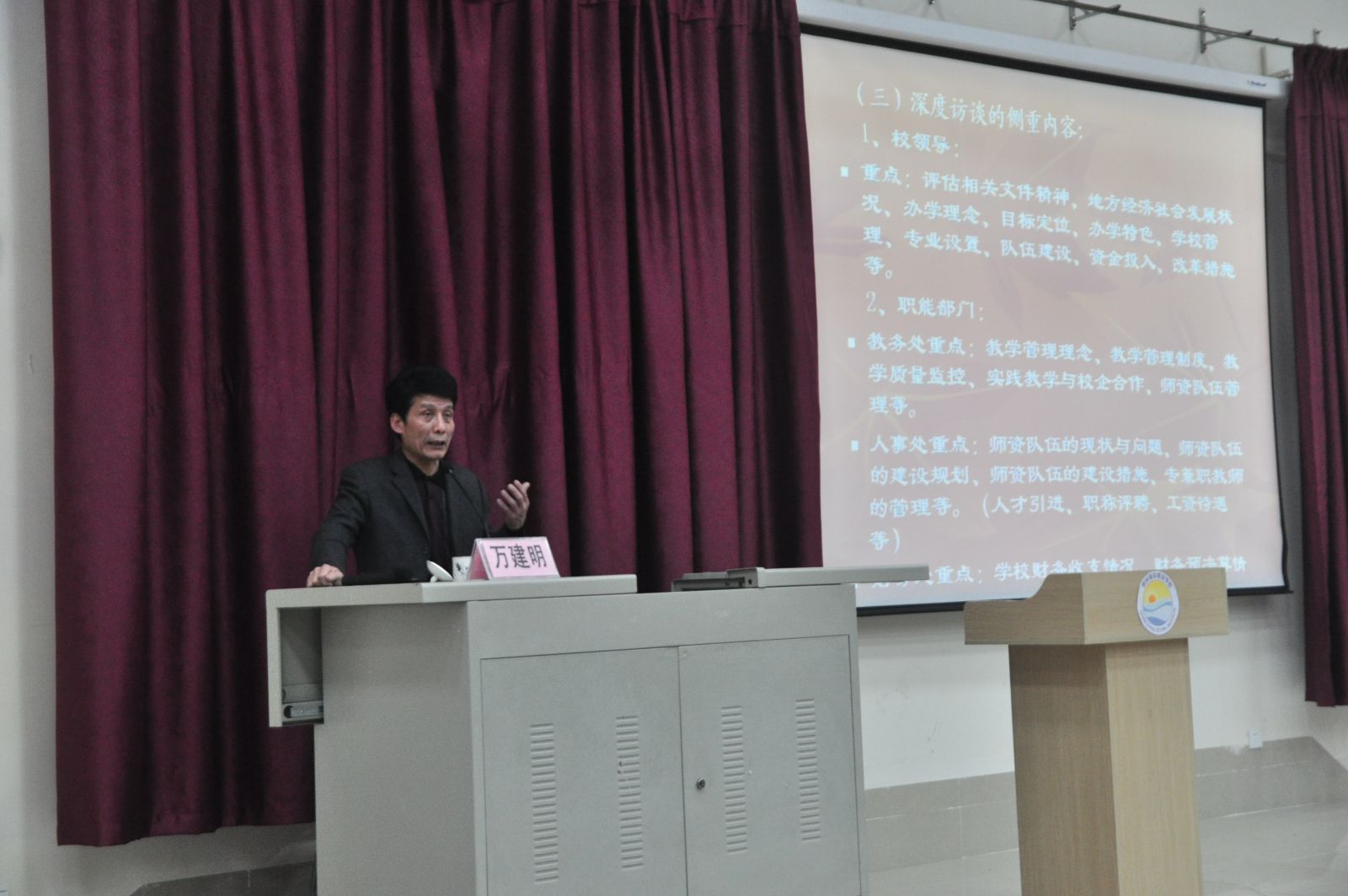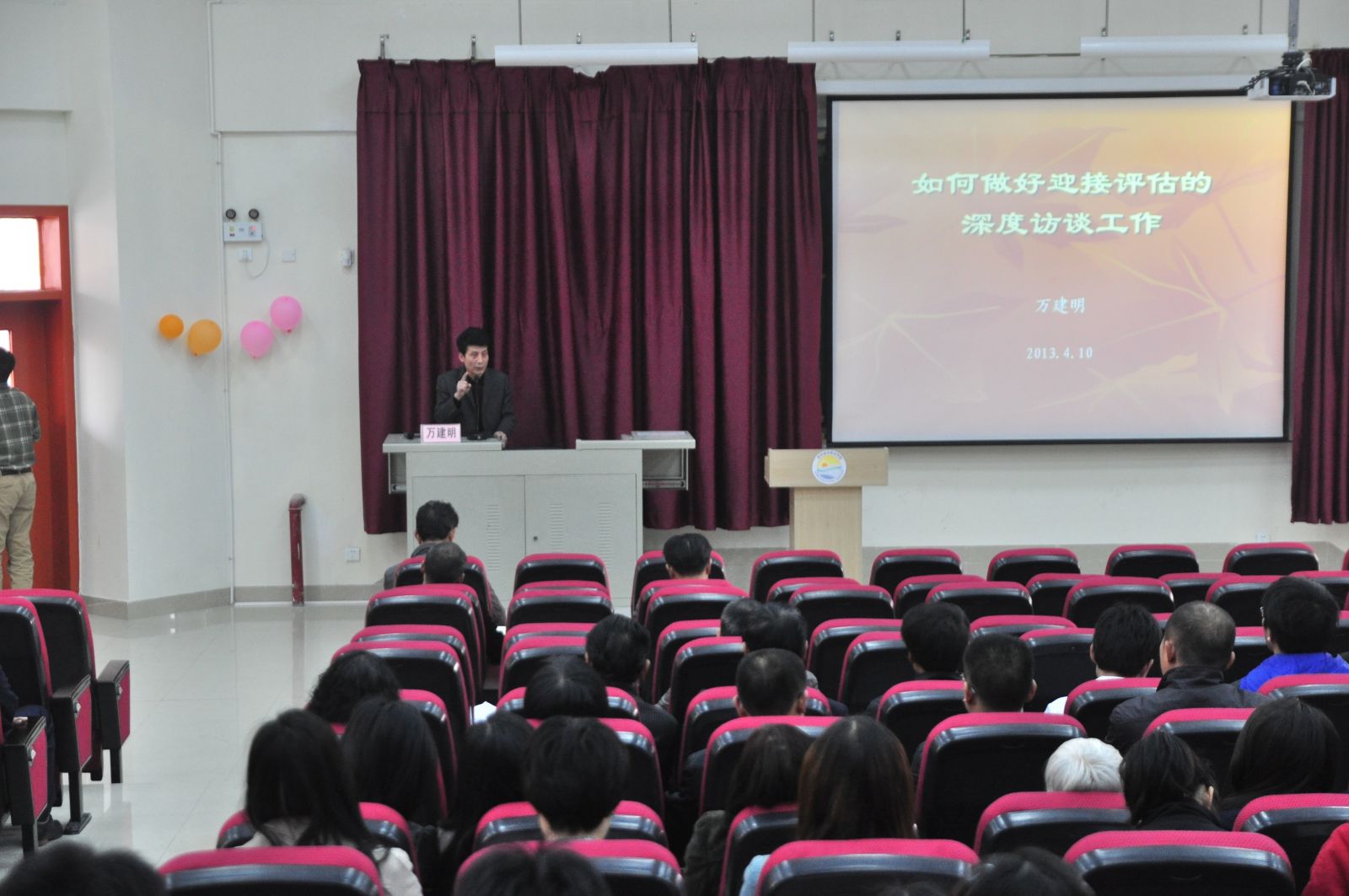 万书记首先和师生们交流应如何做好迎接评估的深度访谈工作。他对此划分了三个阶段:资格审查——实际评估——回访,并分别对这三个阶段作出了仔细的解析。接着又从为什么要进行深度访谈以及深度访谈的对象、形式和内容,将如何做好准备的五个方面给我们着重进行了详细的分析,使全体教职工与学生干部进一步明确了学院评估工作的形势以及做好此次迎接评估工作的重要意义。