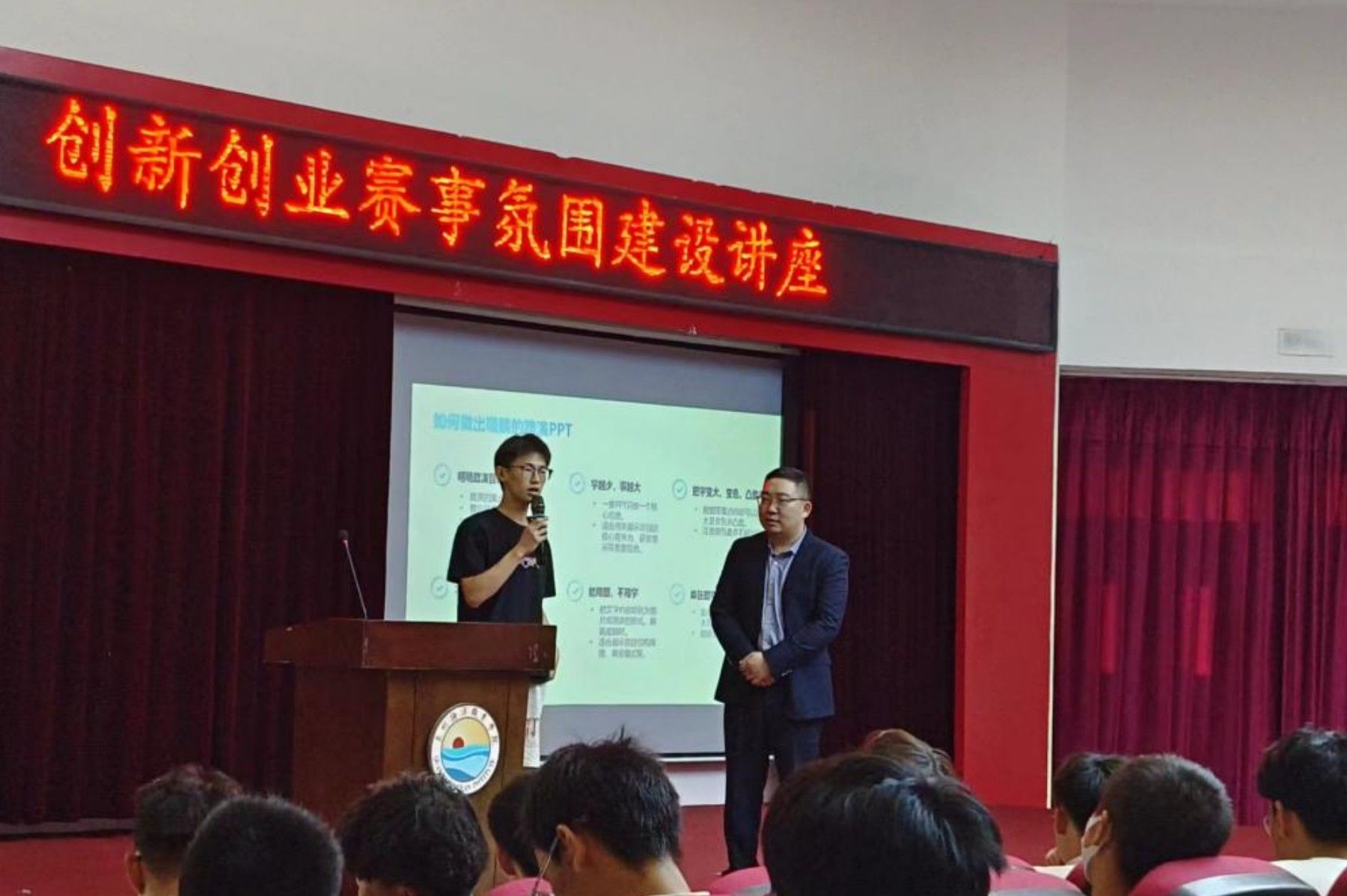 在讲座中,霍红光老师向同学们分享了自己的创业经历及心得,让同学们对创业有了更深入的了解。霍老师结合多年的创新创业赛事辅导经验,他全面的为同学们讲解了赛事重点与注意事项,并双创赛事路演PPT的质量提升进行分析。