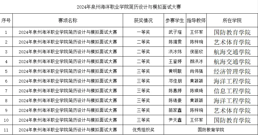 为提高我校学生求职面试能力,增强学生求职竞争力,6月13日,我校2024年简历设计与模拟面试大赛决赛在2204报告厅举办。出席决赛的领导有对外合作处副处长蒋滨滨、海洋工程学院党支部兼三创学院副院长周甜,担任评委的有福建锦壹位科技有限公司总经理夏东东、石狮市绅派产业园区运营管理有限公司总经理陈齐波、威康健身管理咨询有限公司人事总监王金周、中国联通泉州市分公司校园BU经理赵颖、学校人事处副科长张永红、轨道交通运输学院办公室主任王平华以及30名师生大众评审团。