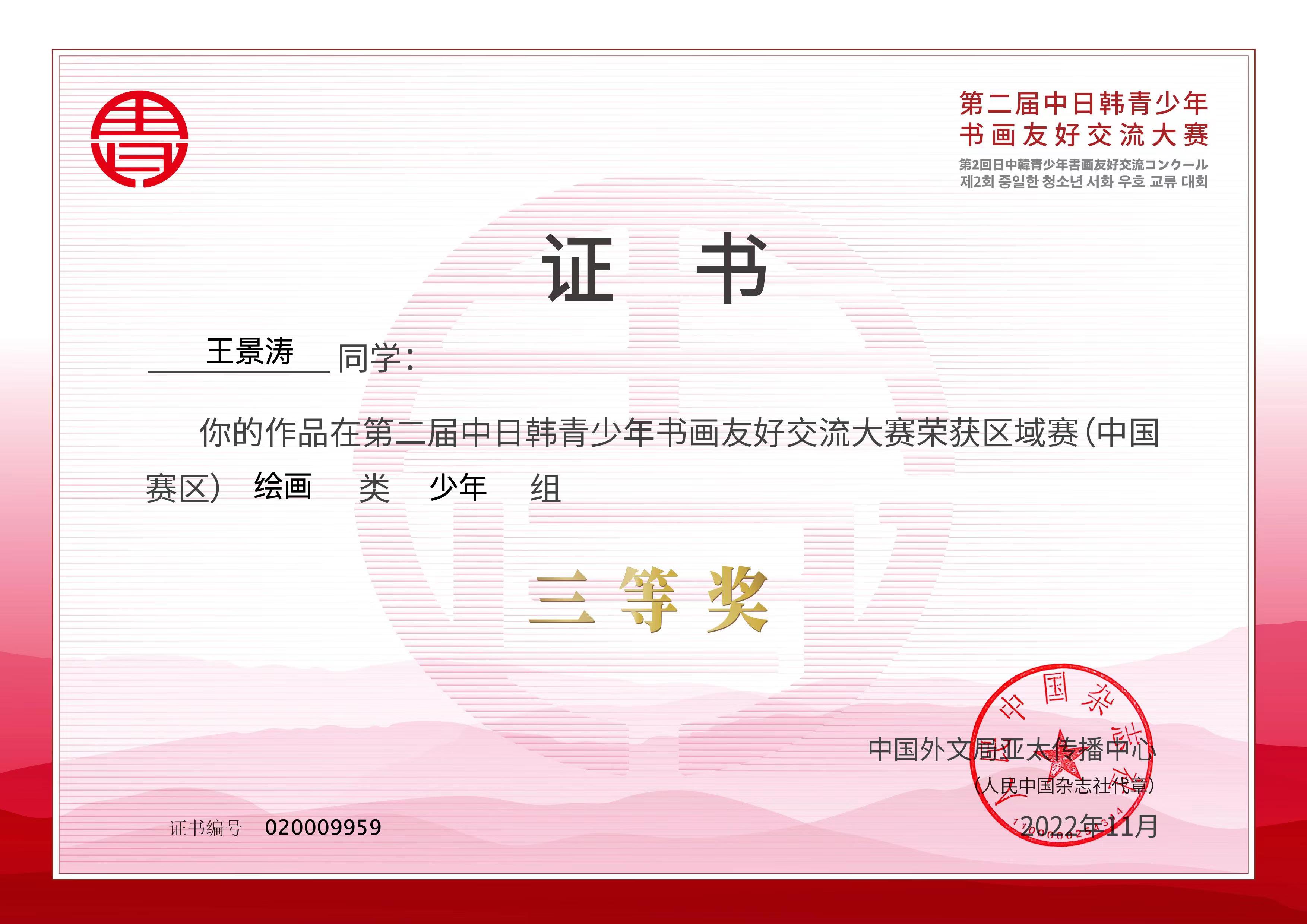 今年是中日邦交正常化50周年和中韩建交30周年,三国政府特组织第二届中日韩青少年书画友好交流大赛,第二届中日韩青少年书画友好交流大赛中国赛区由中国文联(正部级)和中央外文局(副部级)联合主办(该大赛入选教育部学科竞赛白名单),经通识教育学院陈超老师两个半月悉心指导,我校五年制21级航海专业1班王锦涛同学的作品《春光丽日》获得三等奖。