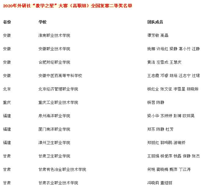 2020年7月2日,外研社“教学之星”大赛(高职组)全国半决赛晋级名单、全国复赛获奖名单发布,我院梁小华、彭博、苏婷婷、欧阳昊团队获外研社组织的全国英语教学之星二等奖!一、二等奖获奖教师团队将获得全国复赛获奖证书及U讲堂教师发展智慧研修卡。