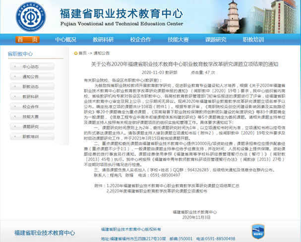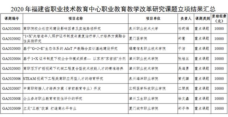 近日,根据福建省职业教育技术中心《关于公布2020年福建省职业技术教育中心职业教育教学改革研究课题立项结果的通知》(闽职教中〔2020〕38号),由我校通识教育学院黄元臻老师主持申报的《STEAM视阈下工程类高职应用型人才的培育研究》课题获重点立项,为我校科研工作取得重大突破。