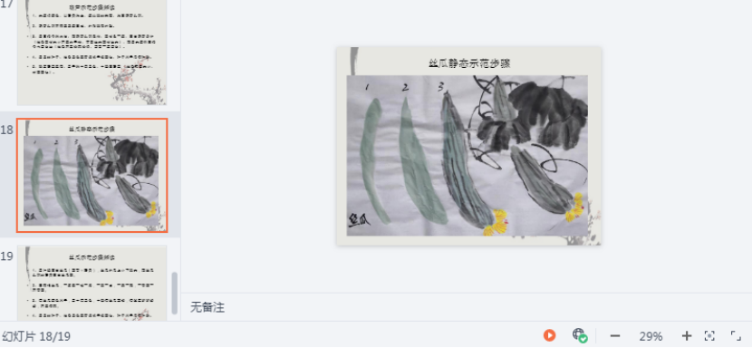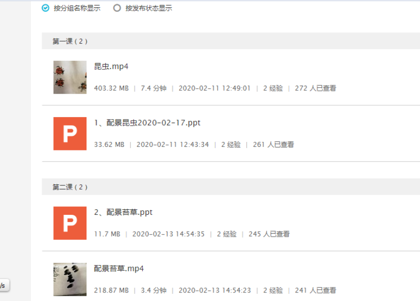 学习资源主要分为课程PPT和课程视频两部分,课程PPT的内容包括:绘画内容介绍、名就名作欣赏与分析、静态示范步骤图、静态示范步骤讲解四个模块。课程视频内容是教师亲自示范的技法和创作表现过程。目前以在“蓝墨云班课”平台上传17个教学课件其中PPT七个、视频示范10个。