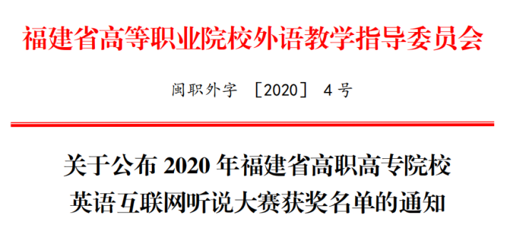 泉州海洋学院学生荣获2020 年福建省高职高专院校英语互联网听说大赛三等奖