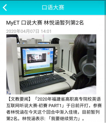 近日,在福建省高等职业院校外语教学指导委员会举办、黎明职业大学承办的2020 年福建省高职高专院校英语互联网听说大赛中我校数字媒体技术专业191班学生林悦涵(通识教育学院英语教师集体指导)荣获三等奖。