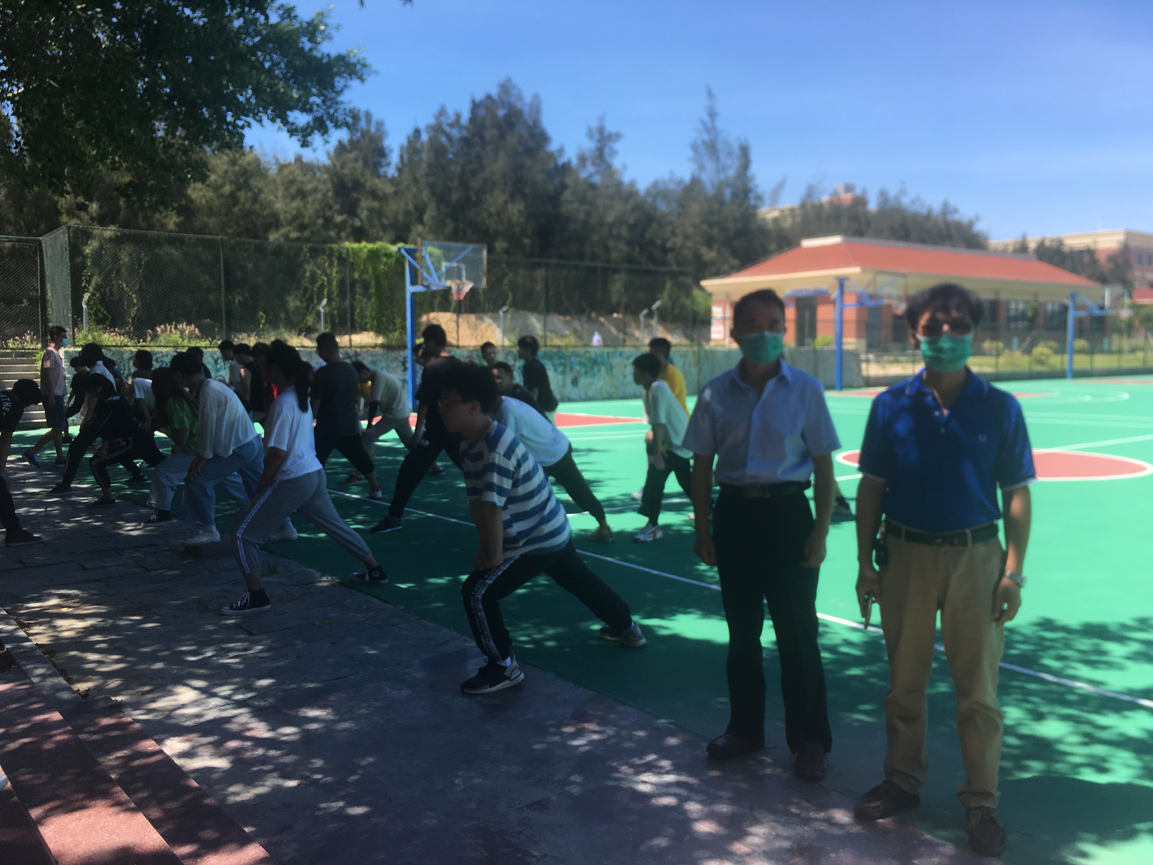 按照防疫要求,这节体育课在户外体育场地进行。教学过程中在相互间保持安全间隔距离的基础上,老师和学生们不戴口罩。课堂中以针对性的练习方法和手段为主,教会学生锻炼方法。蔡清泽老师(体育老师)认为,复学后的体育课要恢复体能的素质练习,避免进行身体直接对抗性和接触性的体育活动,以发展心肺功能的有氧徒手运动和自主单人完成的练习动作为主。