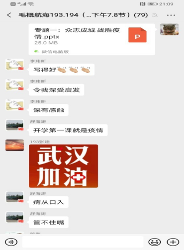 做学问,先学做人。在面对严峻的疫情下,我们可以安然地坐在家中进行学习,是有人在替我们负重前行,是国家这个大后盾保护着我们每个人。因此,开学第一周,我们进行了主题为“众志成城,战胜疫情”的教学。同学们对于此次专题教学十分感兴趣,积极参与讨论。第一次的线上教学尝试可以说是初战告捷。
