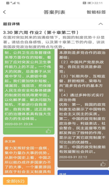 对于教学内容的掌握情况主要是通过作业来进行评判。每节课都会针对教学的重点、难点设计相应的题目,学生在云班课上进行回答,教师会对学生的回答情况进行评分,对优秀的答案在教学群里进行表扬,对过于糟糕敷衍的答案会进行点名批评,以此把控和端正学生对在线教学、作业的态度。