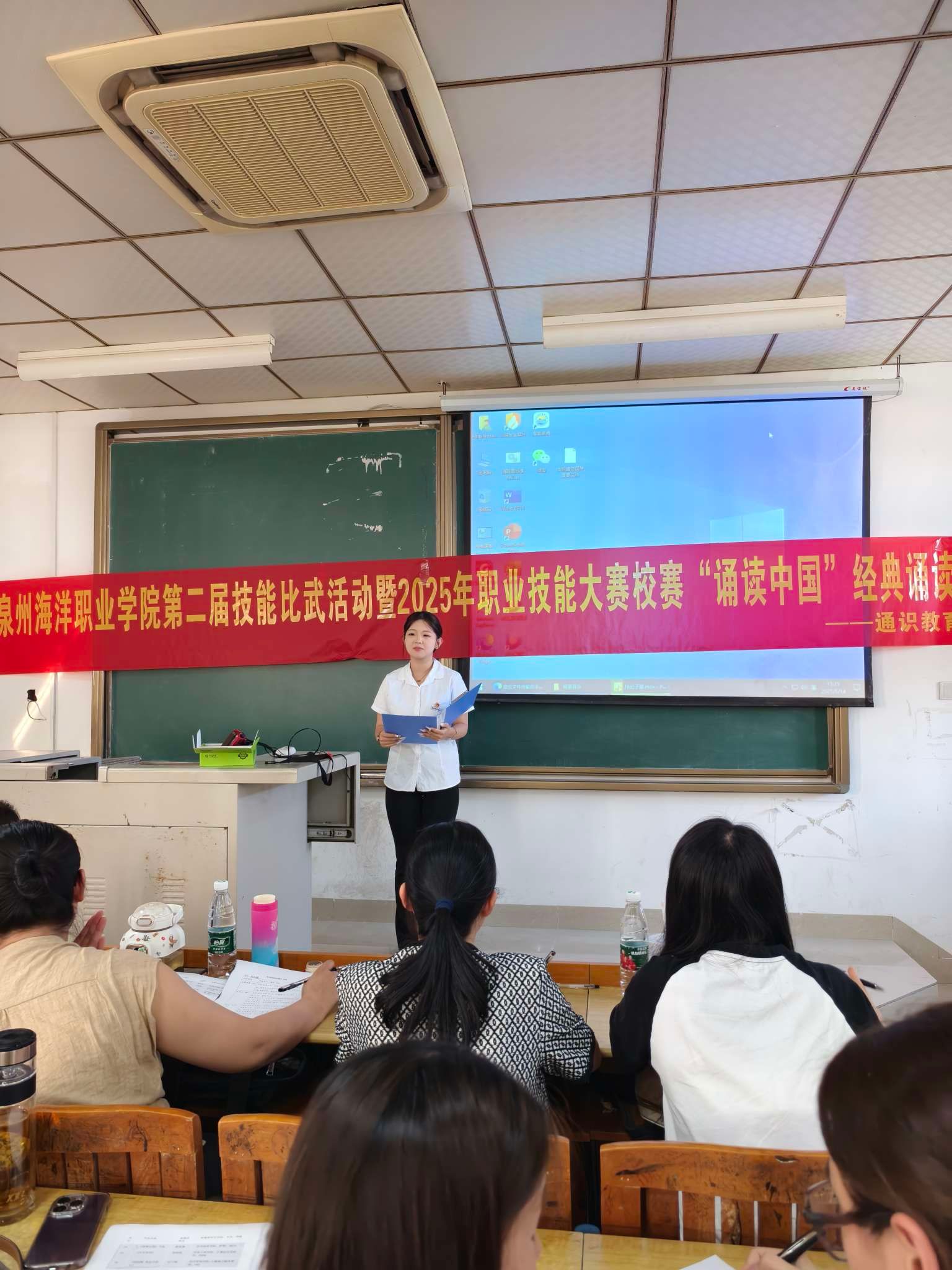 2025 年 5 月 14 日下午 2 点 30 分,泉州海洋职业学院通识教育学院在 2302 教室成功举办了“诵读中国”经典诵读比赛。作为职业教育周的活动之一是本次比赛旨在弘扬中华优秀传统文化,提升学生的语言文化素养,激发学生的文化自信自强,吸引了众多学生踊跃参与。