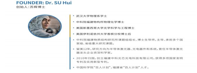 福建中科光芯光电科技有限公司(以下简称“中科光芯”)致力于光芯片、光器件及模组的研发、生产、及销售。公司成立于2011年,由中科院福建物质结构研究所课题组组长、博士生导师,拥有二十多年半导体激光器研发及光电子集成制程平台经验的苏辉博士创立。公司愿景是“致力于成为全球最有影响力的光芯片企业”。公司高度垂直整合(IDM模式),拥有完整的外延生长、芯片微纳加工及器件封装产业线。现有产品包括外延片、芯片(FP、DFB、EML、PD)、TO器件、蝶形器件、OSA器件、iTLA、SOA、SLD、高功率窄线宽激光器等,尤其值得一提的是,公司L band SOA已经大批量发货,高功率SLD已经率先成功取代了400G OTN网络中的L band EDFA,是一家真正拥有独立自主知识产权,能够独立设计并量产光芯片、器件、模组的高新技术企业。中科光芯以石狮、福州、黄石为研发和生产基地,武汉设研发中心。 公司拥有强大的工程及研发团队,包括11位博士,39位硕士,150多位本科及以上学历技术人员。