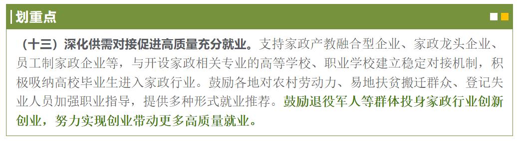 (十三)深化供需对接促进高质量充分就业。支持家政产教融合型企业、家政龙头企业、员工制家政企业等,与开设家政相关专业的高等学校、职业学校建立稳定对接机制,积极吸纳高校毕业生进入家政行业。鼓励各地对农村劳动力、易地扶贫搬迁群众、登记失业人员加强职业指导,提供多种形式就业推荐。鼓励退役军人等群体投身家政行业创新创业,努力实现创业带动更多高质量就业。