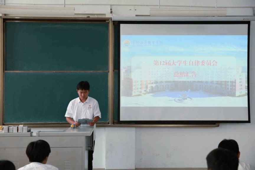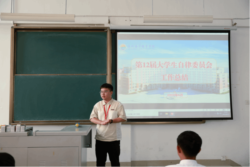 2023年6月12日泉州海洋职业学院大学生自律委员会在教学楼2200召开全体成员大会,出席本次大会的有学生工作与发展部思政科科长蔡岱宏以及全体自律会成员。大会由欧琦靖主持。