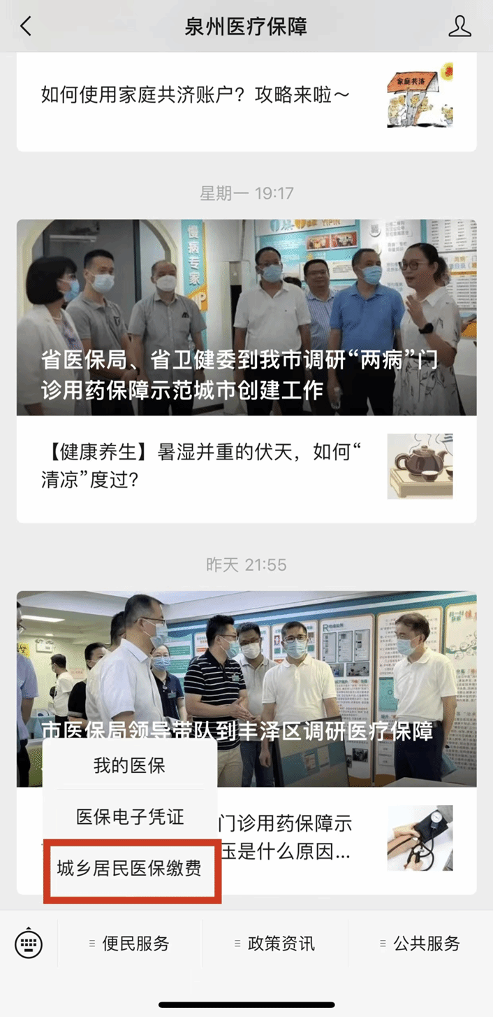 (2)已在泉州参加过居民医保且参保状态正常的同学,可直接关注“泉州医疗保障”微信公众号,点击“城乡居民医保缴费”完成缴费,或关注“福建税务”公众号,点击“医保社保业务”完成缴费。