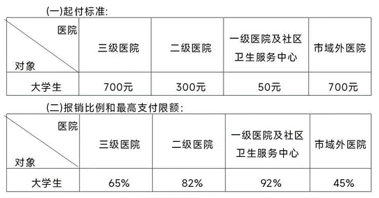 扣除起付线医保范围内费用,泉州市内定点医院住院(或门诊特殊病种)根据医院级别报销65%—92%(非本市户籍的,经备案后在户籍地医院住院的按泉州同级医院报销比例执行),含大病保险每年最高可报40万元;门诊报销70%(限本市基层卫生院或本校的医务室),每年最高可报420元。