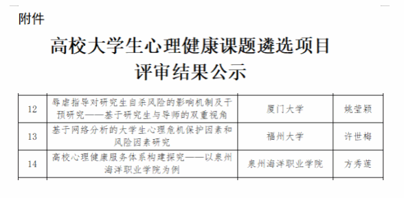 近日,心理中心副主任方秀莲老师在8月份申报的课题项目《高校心理健康服务体系构建探究》通过国家心理健康和精神卫生防治中心审批正式立项,我校是福建省唯一立项的高职类院校。据悉,此次大学生心理健康课题由国家心理健康和精神卫生防治中心联合中国教育发展基金会共同举办的,为了推动高校大学生心理健康工作规范发展,为社会心理服务体系建设提供理论支持。
