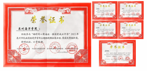 在中共泉州市委宣传部,中共泉州市委统战部,泉州市民族与宗教事务局,共青团泉州市委员会共同举办的“泉州市民族团结进步宣传主题短视频征集活动”,我校团委精心组织,积极参与,获得“优秀组织奖”。由我校学生周颖、侯玲娜、邱煌雅,指导老师陈合喜、肖伟强共同完成的短视频《寻访惠安女红色足迹,传承将军庙革命精神》荣获一等奖(泉州高职院校唯一)。
