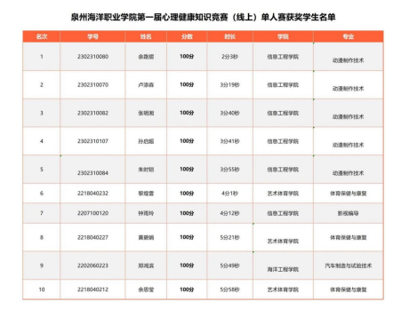 自10月11日开启线上心理健康知识竞赛答题以来,共计722名同学参与其中。最终根据同学们的答题分数情况(同分情况下比较答题用时)进行先后排名,最终评选出前10名。