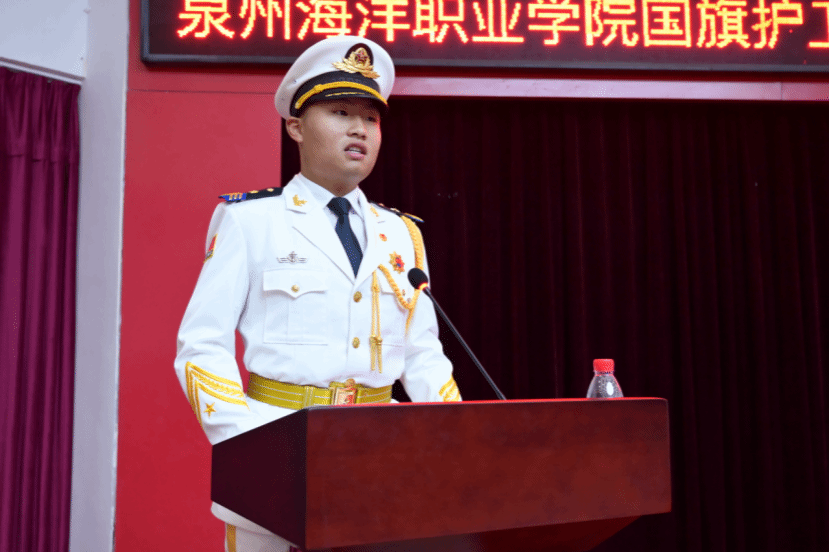 国旗护卫队指导员林炜皓对新入队的队员表示祝贺,期望新队员能够承担起护卫国旗的重任,投入饱满的热情,严格要求自己,并对国护未来发展提出要求,表达了大家共同前行,一起建设泉海国护美好未来的愿景。