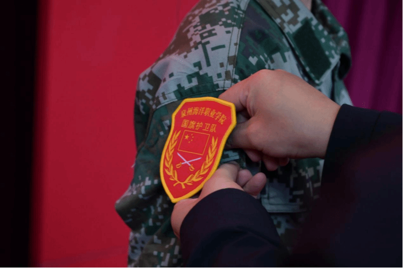 在全体到场成员的共同见证下,学生工作与发展部张君、蔡岱宏、黄安娜三位老师依次为新队员们佩戴国旗护卫队臂章。