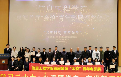 为了深入贯彻习近平新时代中国特色社会主义思想,坚定新时代青年的理想信念,提高自身的思想政治素质,给泉海广大影视爱好者提供一个集中展示优秀电影作品的平台。2023年12月13日下午,信息工程学院首届泉海“金浪”青年电影展颁奖典礼于图书馆二楼学术报告厅隆重举行。