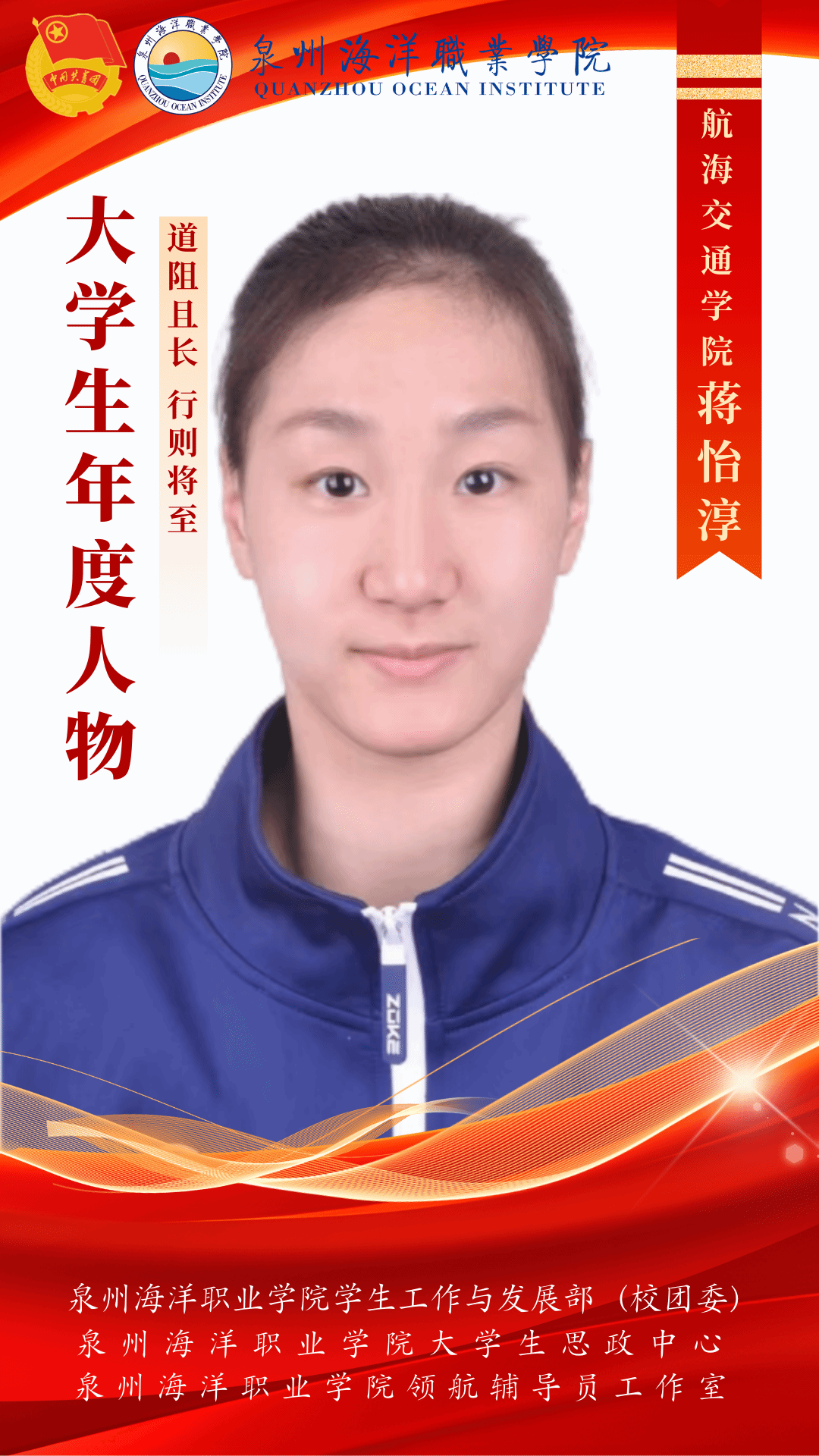 蒋怡淳,四川省遂宁市人,航海2305班学生,性格开朗,奋斗自律。致力于德智体美劳全面发展,成为一名德才兼备的优秀大学生。该生在2013年被四川运动管理中心选为储备人员,自2013年8月至2023年8月在四川省花样游泳队专修花样游泳,参加过多次比赛,获得多项荣誉。