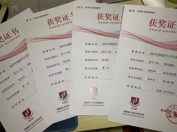2023年6月福建省大学生游泳锦标赛丁组50米蝶泳第四名。