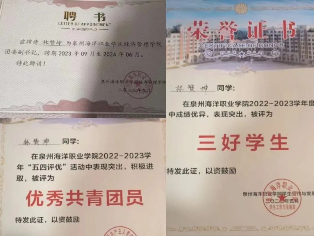 2023年05月荣获泉州海洋职业学院“三好学生”;