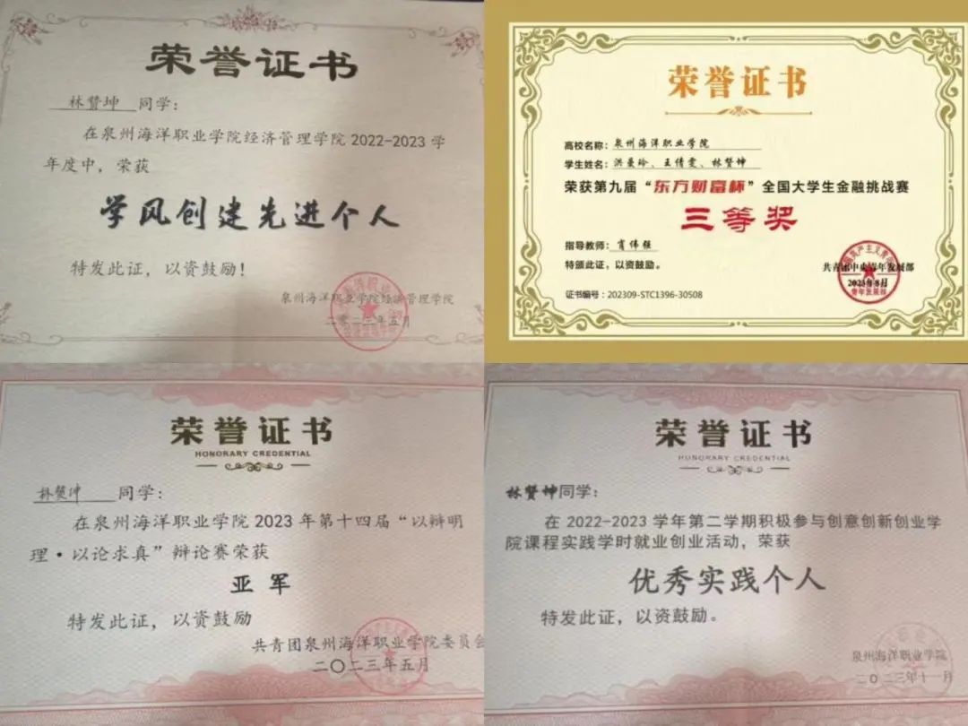 2022年12月荣获泉州海洋职业学院经济管理学院新生辩论赛“最佳辩手”;