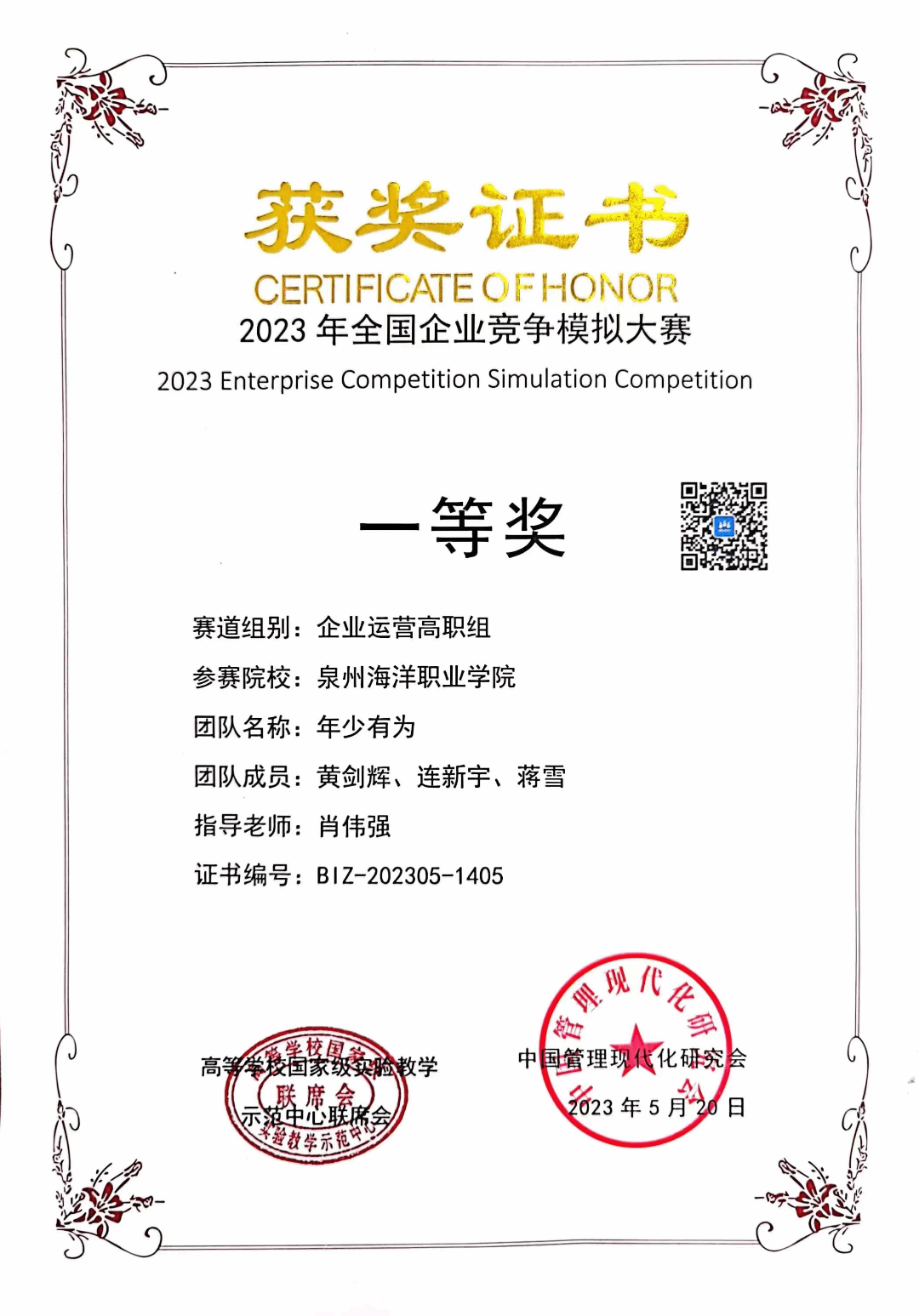 2023年5月荣获全国企业竞争模拟大赛一等奖;