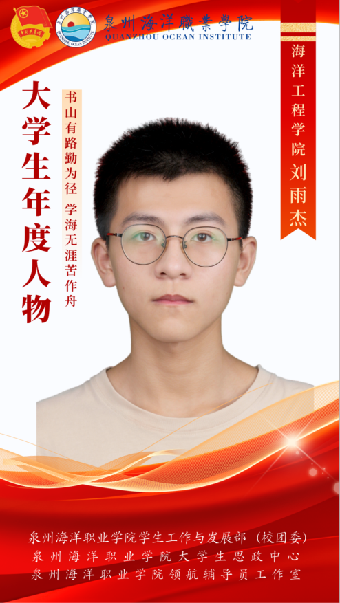 刘雨杰,福建省泉州市人,共青团员,海洋工程学院智能221班学生,性格开朗,积极向上。致力于德智体美劳全面发展,成为一名德才兼备的优秀大学生。“我之所以能,是因为我相信能。”这一信念激励着刘雨杰在各个领域中追求卓越。自入学以来,刘雨杰在专业课程上表现出色,成绩名列前茅,综测专业第二。