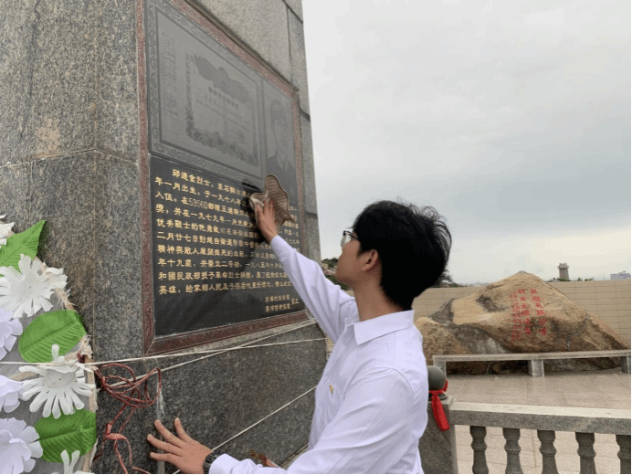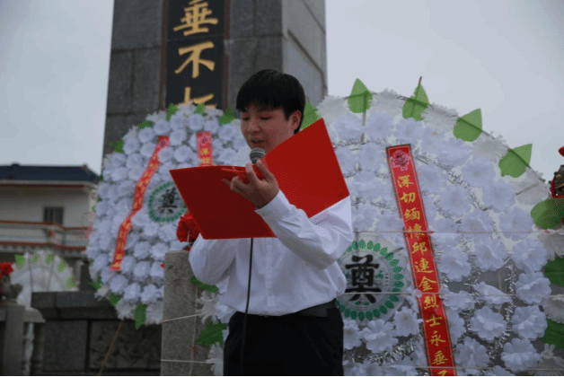 接着,全体师生依次绕行瞻仰邱连金烈士纪念碑并献上鲜花。随即,全体肃穆,默哀一分钟,表达对邱连金烈士无限的哀思、崇敬与感念。