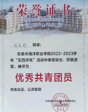 2023年05月荣获泉州海洋职业学院“优秀共青团员”;
