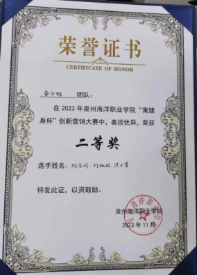 2023年11月泉州海洋职业学院“寓健身杯”创新营销大赛二等奖;