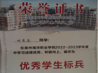 2023年5月被泉州海洋职业学院评为“优秀学生标兵”;