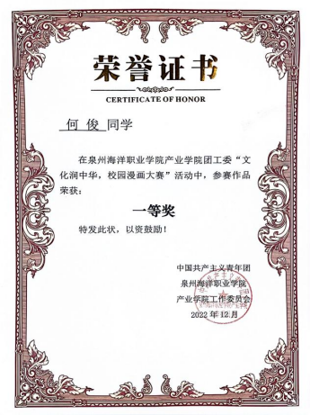 2022年12月在产业学院团工委“文化润中华,校园漫画大赛”活动中,参赛作品荣获“一等奖”