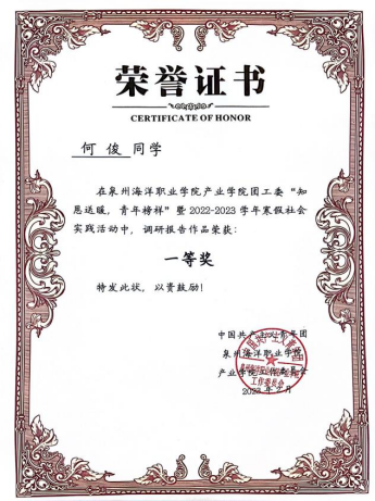 2023年2月在产业学院团工委“知恩送暖,青年榜样”暨2022-2023学年寒假社会实践活动中,调研报告作品荣获“一等奖”。