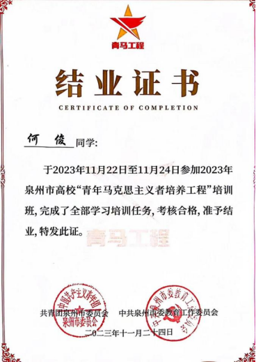 2023年5月荣获泉州海洋职业学院“优秀共青团员”荣誉称号。