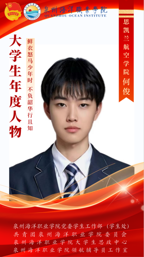 何俊,男,汉族,福建三明人,现任校团委组织部第一负责人,产业学院团工委学生会执行主席,思凯兰航空学院22级团支部书记。他一直坚信唯有为了梦想而不断前进,才能够演绎成功的人生。该同学自入校以来,从各方面严格要求自己,注重综合素质的提高,在思想、学习、工作等各方面有较为突出的表现。