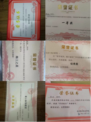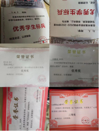 2023年获评泉州海洋职业学院“优秀学生标兵”荣誉称号——吕晓华、赵庆、蔡悦彤、郑宇、黄永潍、曾昕