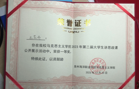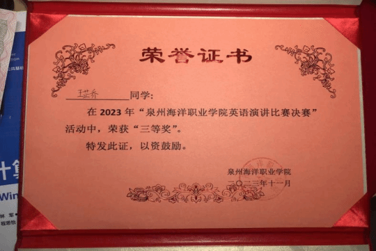 王芷乔同学在2023年“泉州海洋职业学院英语演讲比赛决赛”活动中,荣获“三等奖”