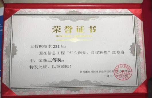 大数据231班在2023年“泉州海洋职业学院信息工程学院红歌比赛决赛”活动中,荣获“三等奖”